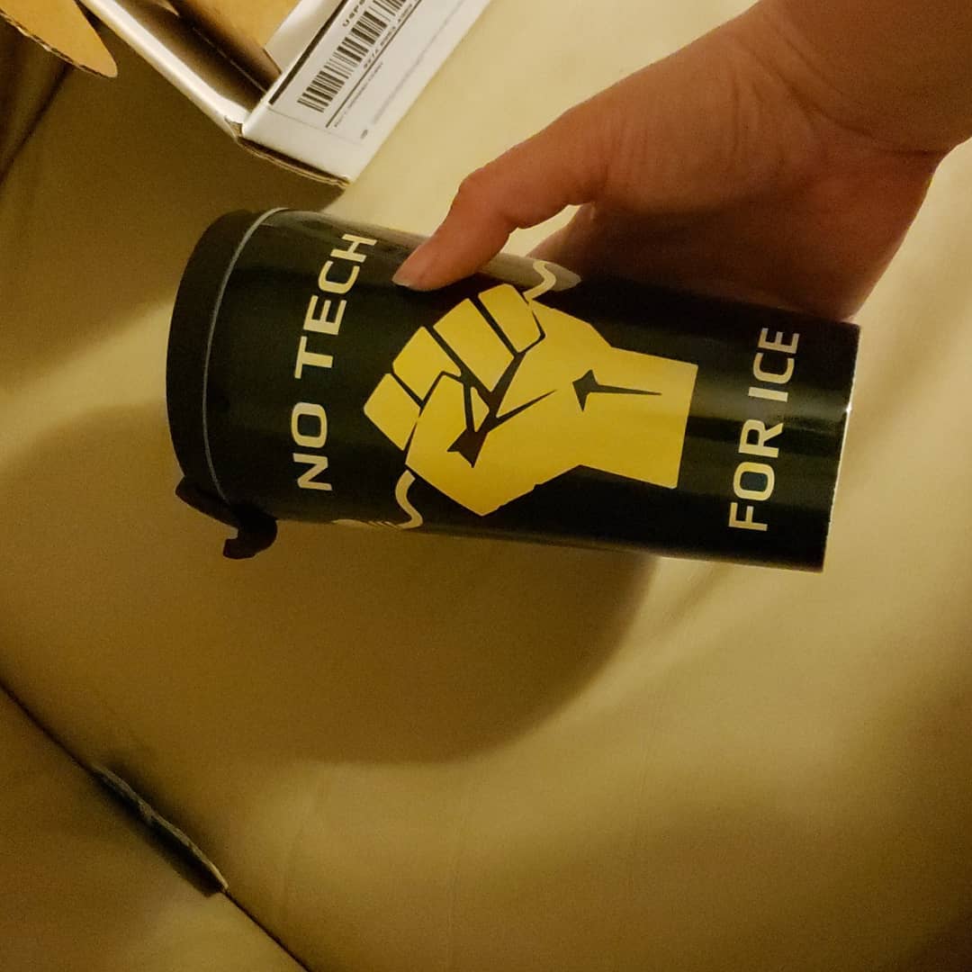 This travel mug is my most recent pieces of Statement-Wear. As someone who works at Amazon, although not on software used by ICE, I feel it is important that my colleagues know where I stand. I want to encourage an environment were we can grapple with political ramifications of work, build connections with potential allies and set standards for what we find unacceptable.