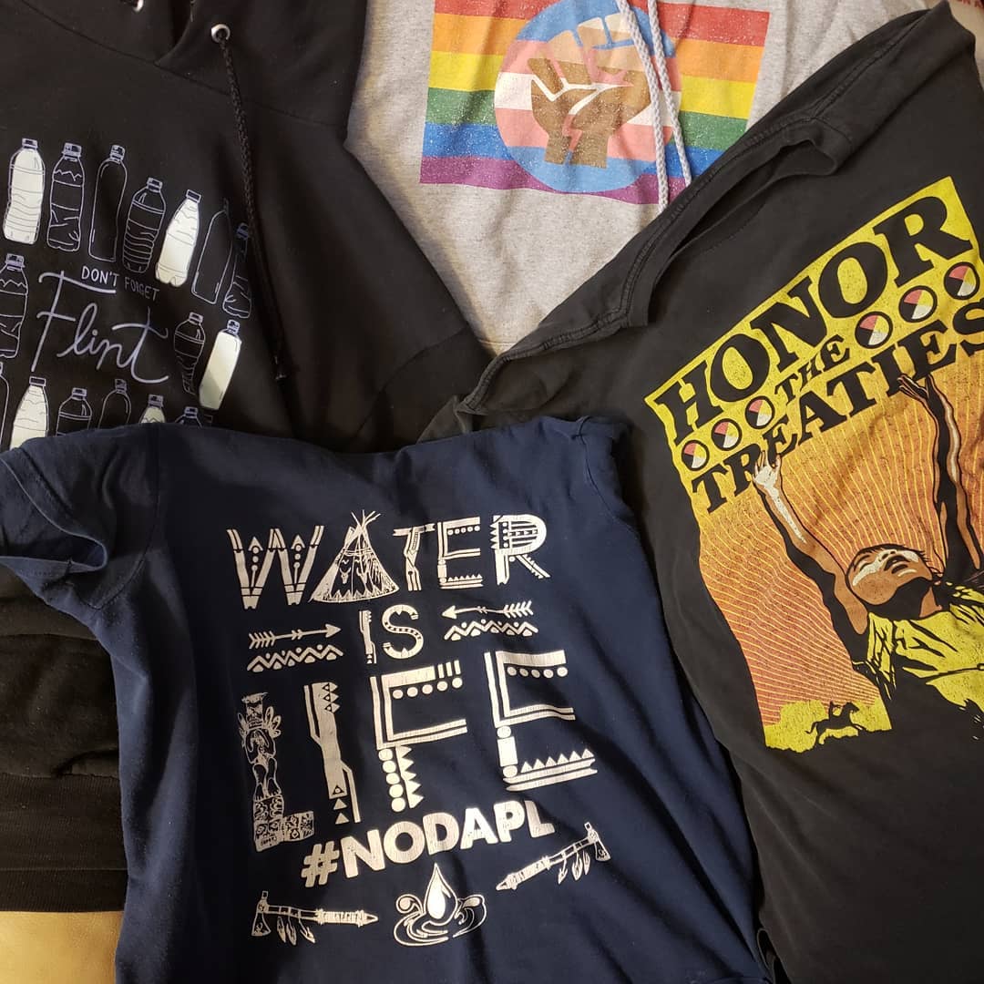 I have several pieces of Statement-Wear I've accumulated over the years and still have great conversations over. My favorite of these honestly has been the Honor the Treaties shirt that I picked up several years ago. The most common question I get asked regarding this shirt is "Which treaties?" to which my first deadpan reply is invariably "All of them?!?" We then transition into a more nuanced conversation about laws regarding keeping native children in native families which was the initial campaign out of the Lakota Law Project. My next favorite is my Don't Forget Flint sweatshirt, one of Little Miss Flint Mari Copeny's fundraisers for her hometown of Flint which was disastrously impacted by terrible water policies.